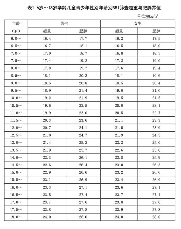 體質(zhì)指數(shù)(BMI)是國(guó)際社會(huì)推薦的評(píng)價(jià)兒童(≥2歲)超重和肥胖的首選指標(biāo),BMI=體重(kg)÷身高的平方(m2)。孩子每個(gè)年齡階段的BMI是不一樣的:1歲時(shí)BMI值最高,隨后開(kāi)始下降,到6歲~7歲脂肪重聚期開(kāi)始出現(xiàn)反彈,此后逐漸升高至接近成年人的水平。2-5歲兒童參考“中國(guó)0-18歲兒童、青少年體塊指數(shù)的生長(zhǎng)曲線”中2-5歲兒童超重和肥胖BMI篩查界值,6歲及以上兒童參考中國(guó)行業(yè)標(biāo)準(zhǔn)“學(xué)齡兒童青少年超重與肥胖篩查”(WS/T 586-2018)界值點(diǎn)。