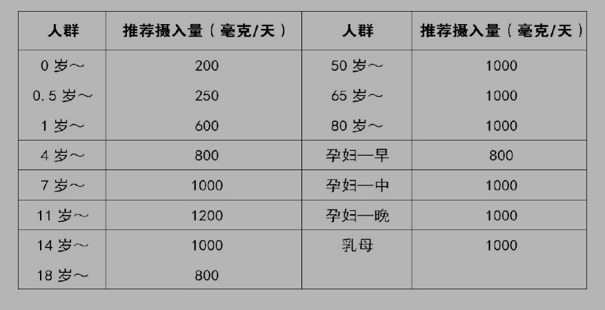 大家可以參考我國居民膳食指南推薦每日鈣攝入量(如上表)。