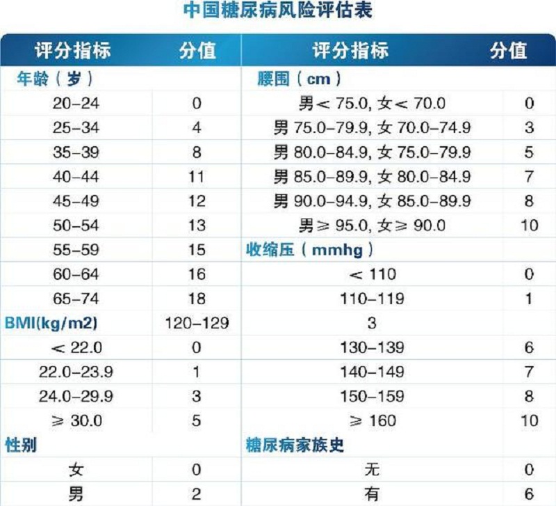 中國糖尿病風(fēng)險評估表:根據(jù)下表計算分?jǐn)?shù),了解你是否有換上二型糖尿病的風(fēng)險,風(fēng)險評估數(shù)值<25,低風(fēng)險;≥25,高風(fēng)險;